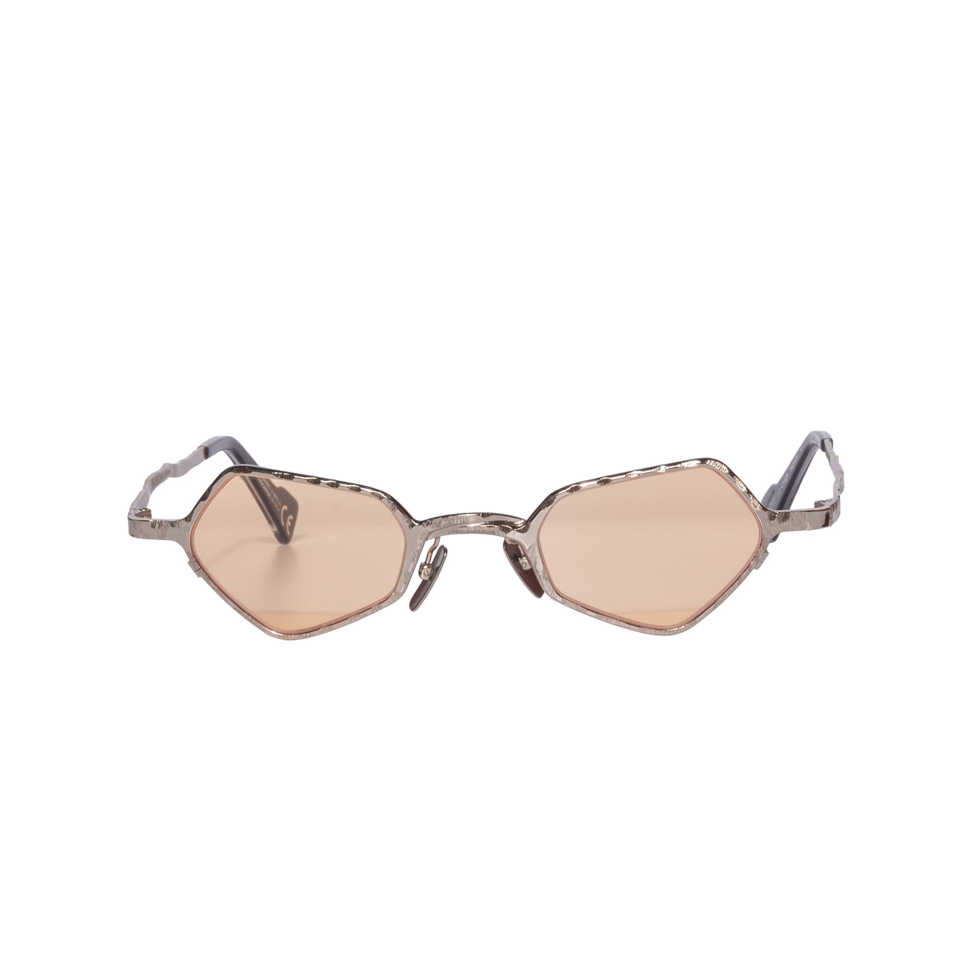Un' occhiale fatto a mano in metallo martellato nella colorazione silver unisex con lenti ocra antiriflesso interno dalla forma geometrica e naselli in titanio per un confort maggiore sul viso.