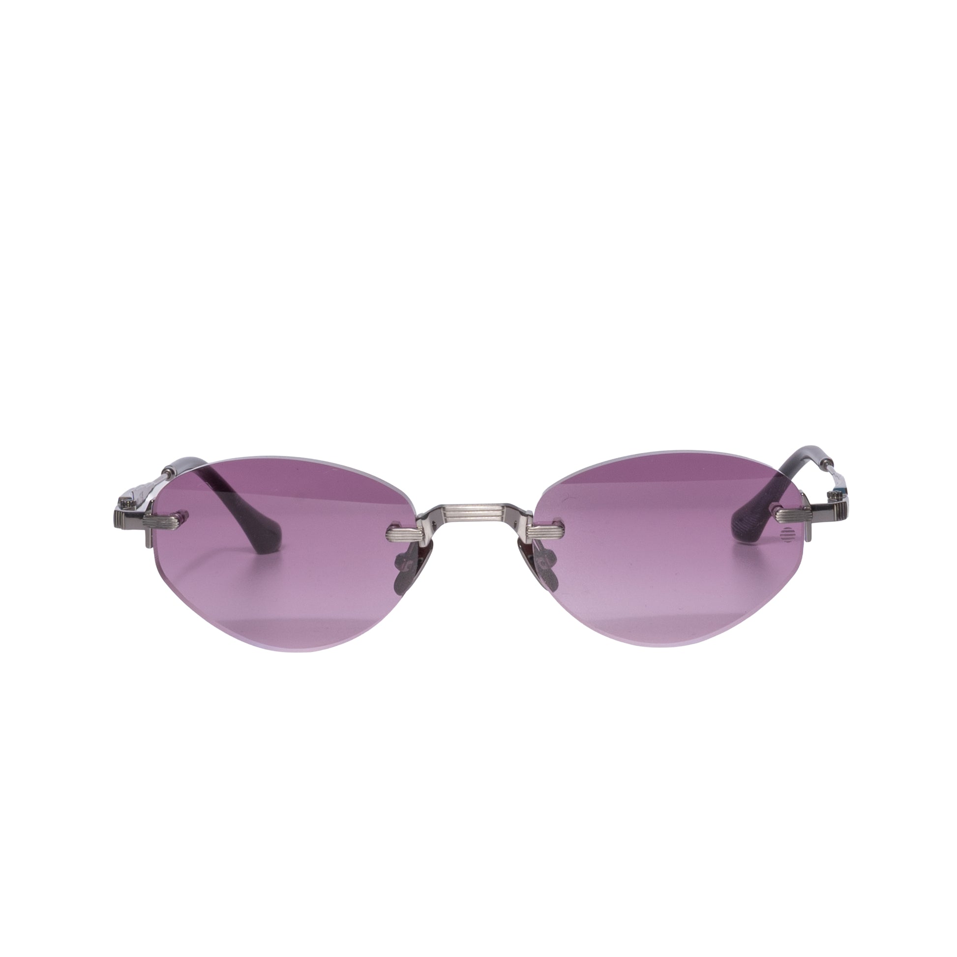 Un'occhiale fatto a mano in titanio leggero nella colorazione grigio antracite con lenti spessorate viola,il modello ha una forma ovale schiacciata ed allungata.Questo modello nudo è fatto completamente in titanio sia il ponte che le aste e terminali in acetato che rendono l occhiale leggero al viso per un confort maggiore.