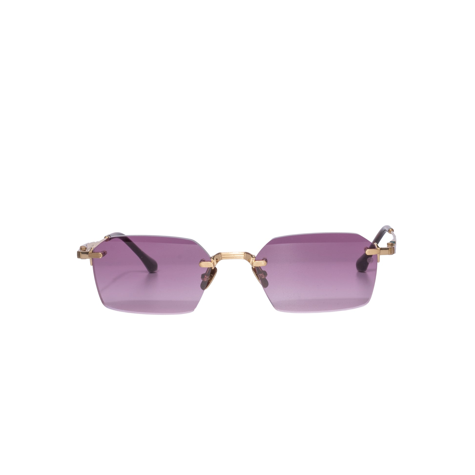 Un'occhiale fatto a mano in titanio leggero nella colorazione oro con lenti spessorate viola sfumate,il modello ha una forma squadrata e naselli il titanio.Questo occhiale nudo è fatto completamente in titanio sia il ponte che le aste e terminali in acetato che rendono l occhiale leggero al viso per un confort maggiore.