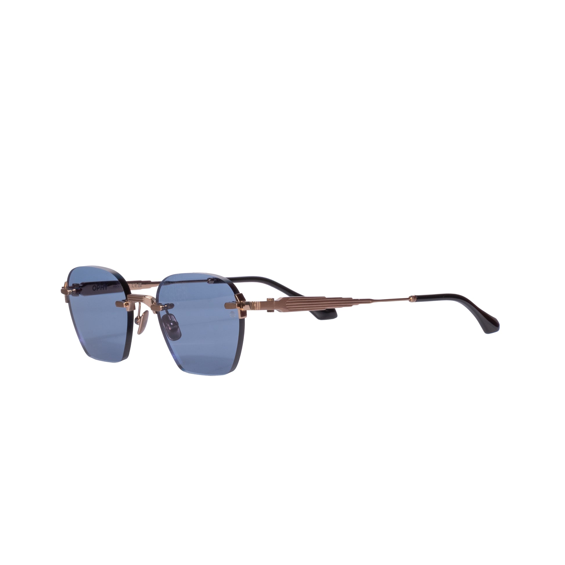 L' Ophy Cube 3 dal colore oro è un occhiale realizzato a mano in Italia in titanio con lenti blu e antiriflesso interno adatte anche al montaggio di lenti correttive o di lenti personalizzate da sole.
