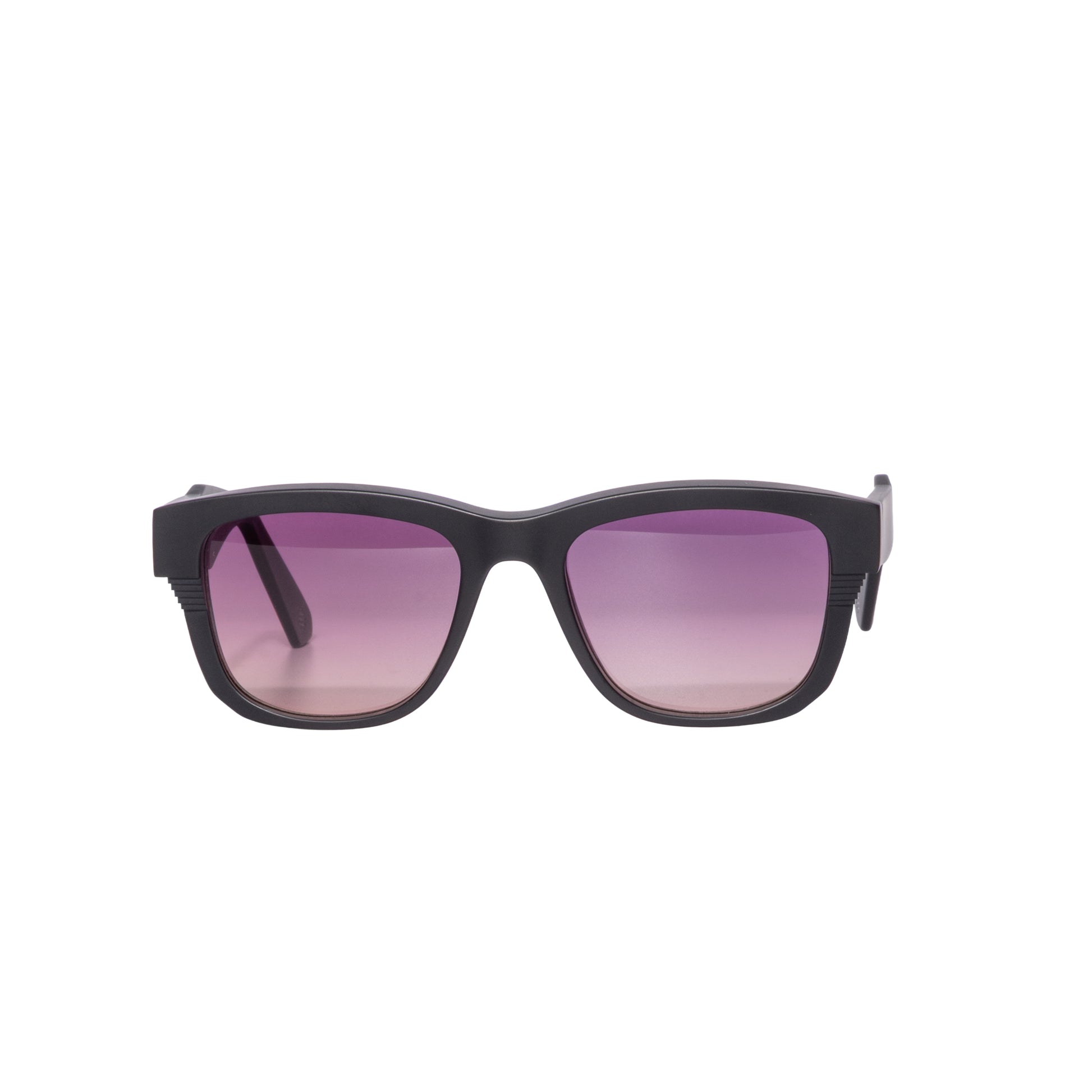 Un'occhiale fatto a mano in acetato nella colorazione nero satinato con lenti color viola sfumate, il modello ha una forma squadrata doppia con aste spessorate che lo rende unisex e grazie all acetato Mazzucchelli di prima qualita il modello è molto leggero sul viso.