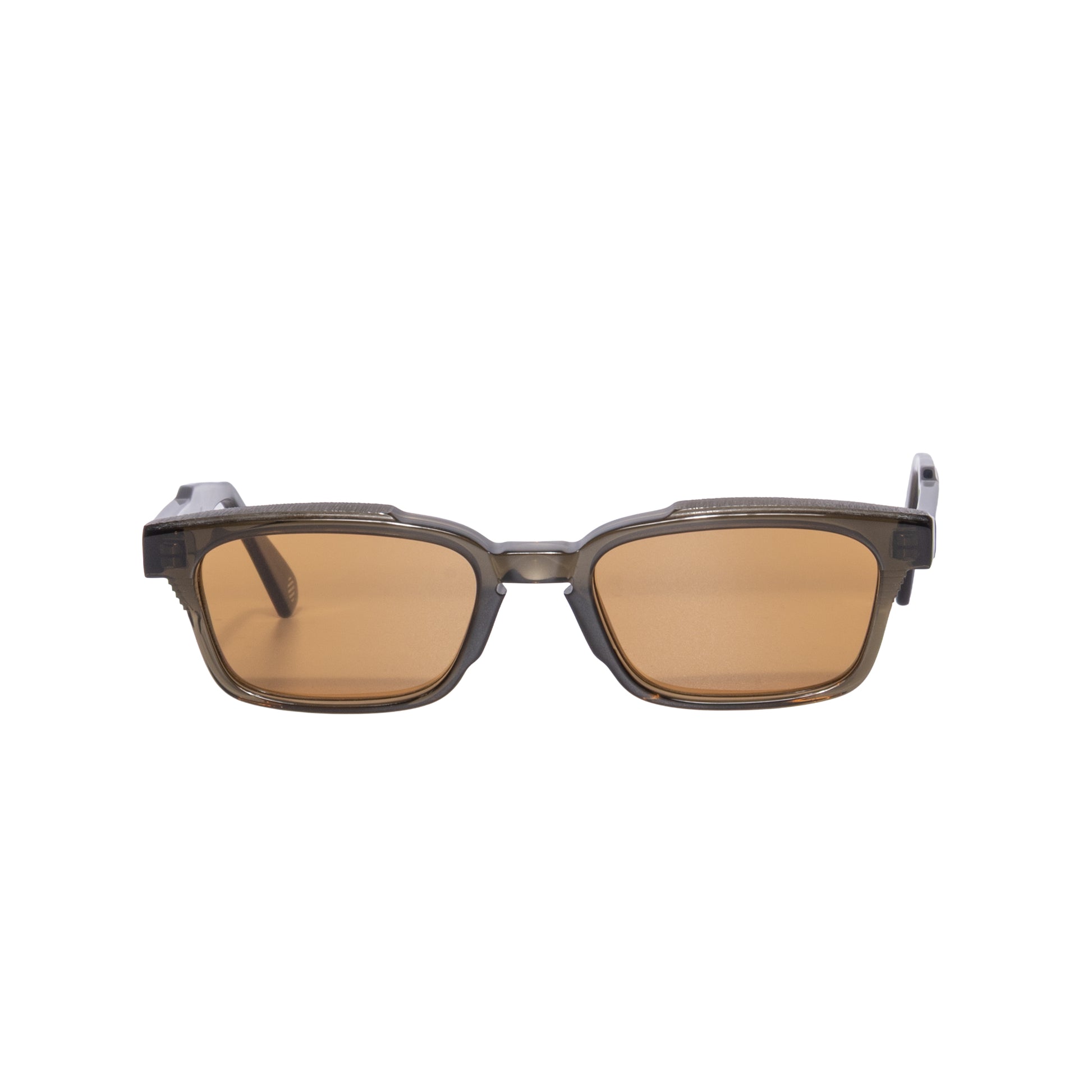 Un'occhiale fatto a mano in acetato nella colorazione oliva con lenti color arancio adatte anche alla visione serale, il modello ha una forma squadrata sottile con aste spessorate che lo rende unisex e grazie all acetato Mazzucchelli di prima qualita il modello è molto leggero sul viso.