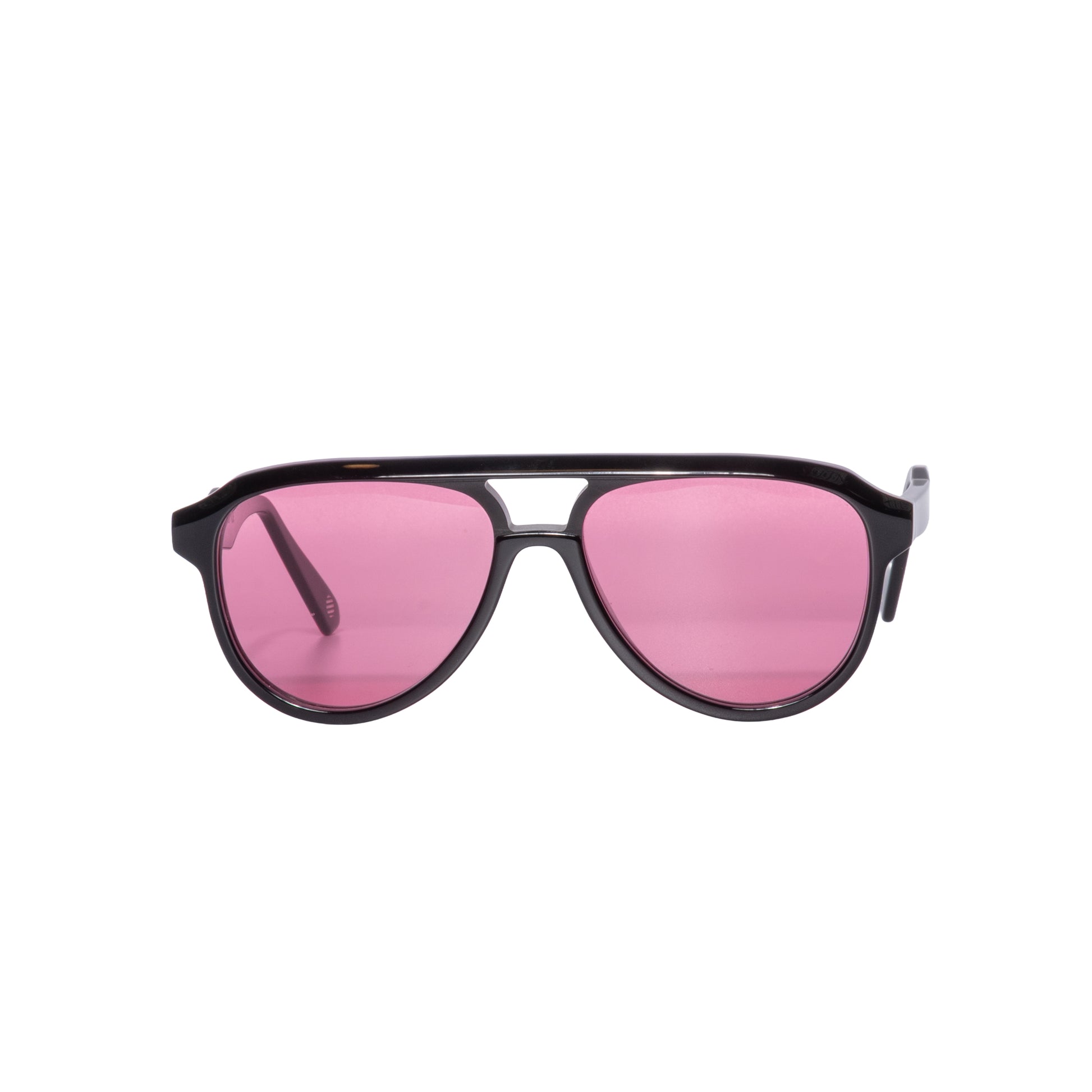 Un'occhiale fatto a mano in acetato nella colorazione nero lucido con lenti color viola intere adatte anche alla visione serale, il modello ha una forma aviator con doppio ponte sottile con aste spessorate che lo rende unisex e grazie all acetato Mazzucchelli di prima qualita il modello è molto leggero sul viso.